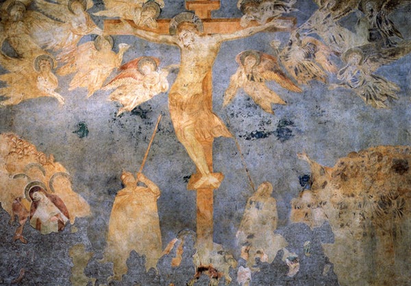 Crocifissione, 1277-1280 circa Assisi, San Francesco, basilica superiore, transetto destro. Purtroppo, la lettura filologica di questo complesso spartito è estremamente difficoltosa; gli affreschi del transetto e dell'abside ci sono infatti giunti in un stato di conservazione piuttosto compromesso. Cimabue fece un uso massiccio di ritocchi a tempera, stesi sull'intonaco asciutto, che già in antico dovevano essersi distaccati dalla superficie dei dipinti. |