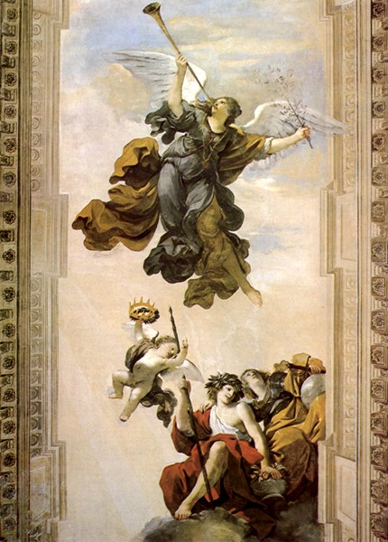 La Fama con l'Onore e la Virtù, 1621, particolare; Roma, casino Ludovisi. Nel febbraio del 1621 Alessandro Ludovisi, arcivescovo di Bologna, divenne papa col nome di Gregorio XV e subito il nipote Ludovico Ludovisi divenne cardinale. Questi comprò allora a Roma il casino presso porta Pinciana dal cardinale Del Monte; nel luglio del 1621 erano già iniziati i lavori di decorazione, affidati a Guercino e Agostino Tassi, autore delle finte architetture. L'Aurora è dipinta nella sala centrale del pianterreno e la Fama è al piano superiore: i due dipinti alludono alla promettente nascita del nuovo pontificato. L'intero programma pittorico del casino fu probabilmente ideato dal marchese Enzo Bentivoglio, ambasciatore a Roma degli estensi, uomo di lettere, che già nel 1617 aveva commissionato a Guercino le decorazioni per il proprio palazzo a Bentivoglio. La fonte principale delle immagini fu l'Iconologia di Cesare Ripa, edita di nuovo nel 1618. |