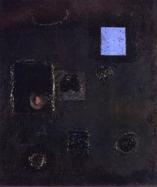 Nero I, 1948 catrame, olio, smalto e pietra pomice su tela; Città di Castello, Fondazione palazzo Albizzini. Il dipinto è una sorta di dichiarazione di poetica: Burri indica le sue coordinate estetiche che si collocano tra ricerca sulla materia e rigore geometrico. |