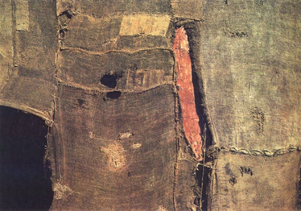 Sacco S 3, 1953 sacco, tela, vinavil e olio su tela; Città di Castello, Fondazione palazzo Albizzini. I sacchi di Burri rappresentano una fondamentale innovazione del pensiero estetico contemporaneo. Al loro apparire suscitarono scandalo, ma alla fine degli anni Cinquanta facevano già parte della storia dell'arte del Novecento. |