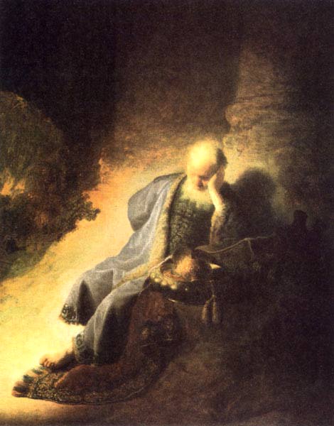 Geremia lamenta la distruzione di Gerusalemme, 1630, Amsterdam, Rijksmuseum. È una delle opere più importanti realizzate da Rembrandt nel periodo di Leida. Durante il Settecento e l'Ottocento è stato ritenuto una rappresentazione di Lot davanti a Sodoma in fiamme, oppure Anchise che assiste malinconico all'incendio di Troia o semplicemente come un filosofo in una grotta. L'immagine sembra in realtà riferirsi alla profezia di Geremia sulla distruzione di Gerusalemme da parte di Nabucodonosor e attinge alla tradizione iconografica di origine medievale che raffigura Geremia seduto su un colle fuori Gerusalemme, in posa malinconica. Un tardo esempio è la xilografia della Bibbia stampata ad Anversa nel 1532. La presenza del prezioso vasellame, invece, è un riferimento al racconto della presa di Gerusalemme da parte di Nabucodonosor contenuto nelle Antichità giudaiche di Giuseppe Flavio che Rembrandt possedeva nella traduzione tedesca del 1584; lì è narrato come Nabucodonosor liberò Geremia dalla prigione e lo ricoprì di doni preziosi. |