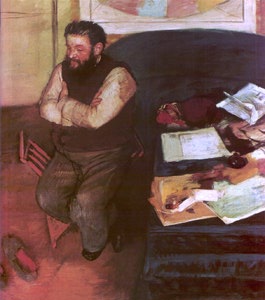 Edgar Degas: Ritratto di Diego Martelli, 1878-1879, Edimburgo, National Gallery of Scotland. Il fiorentino Diego Martelli, critico d'arte e scrittore, era il portavoce dei macchiaioli, gruppo di pittori toscani in contatto con l'impressionismo. Degas lo aveva probabilmente conosciuto a Firenze nel 1859 e poi rivisto a Parigi tra il 1878 e il 1879, quando Martelli lavorava come corrispondente per i giornali italiani in occasione dell'Esposizione universale del 1878. |