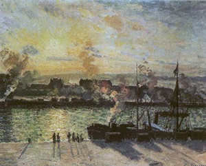 Camille Pissarro: Il porto di Rouen al tramonto, 1898, Cardiff, National Museum of Wales. In seguito all'incontro con Seurat, che nel 1886 partecipò all'ultima mostra impressionista, Pissarro attraverso una fase pointilliste a cui ancora appartiene un quadro come Le spigolatrici. Dall'impressionismo "scientifico" I'artista si allontanò negli anni Novanta per tornare a una pittura più libera della quale llporto di Rouen al tramonto e un tipico esempio. |