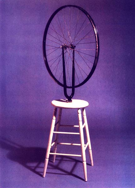 Ruota di bicicletta, 1913-1964. Duchamp ha definito i ready-made "oggetti di serie promossi dalla scelta dell'artista alla dignitö di oggetti d'arte". "Un punto su cui vorrei molto insistere", ha affermato l'artista, "è che la scelta di questi ready-made non è stata mai dettata da un piacere estetico: si è basata su una reazione di "indifferenza visiva", con un'assenza totale di buono o di cattivo gusto [...], di fatto, una anestesia totale". |
