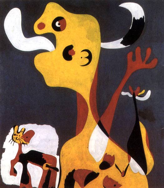 Donna e cane di fronte alla luna, 1936. Alla vigilia della guerra civile spagnola, quando l'universo pittorico di Miró sembra essersi definito e fissato dopo un lungo periodo di ricerca sul piano della tecnica e dei modelli espressivi, l'artista catalano riprende a sperimentare tentando nuove strade. Nel 1934 Miró realizza, su un particolare tipo di carta, una serie di quindici pastelli di grandi dimensioni che preludono ai dipinti cosiddetti "selvaggi" del periodo immediatamente successivo. In contrasto col morbido disegno del pastello, l'artista vi rappresenta figure mostruose, deformate, inquietanti di cui evidenzia il carattere angoscioso mediante il recupero del chiaroscuro e l'abbandono delle forme piatte, sottolineandone la ferocia per mezzo di colori aggressivi e stridenti. È il modo in cui l'artista reagisce alle oscure minacce di un dramma che di lì a poco esploderà in tutta la sua violenza: attraverso la dimensione personale di un'angoscia che trasforma in incubo la realtà, Miró sembra esprimere il suo violento disgusto e la sua rabbia impotente nell'imminenza della catastrofe. |