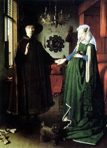 I coniugi Arnolfini, 1434, Londra, National Gallery. Giustamente ritenuto esemplare della produzione eyckiana, il dipinto presenta la coppia di sposi all'interno della camera da letto: soffermiamoci su questa veduta d'interno, minuziosamente osservata in ogni dettaglio e còlta con squisita sensibilità per la composizione spaziale d'insieme. La luce proveniente dalla finestra a sinistra, alle spalle di Giovanni Arnolfini, contribuisce a creare l'effetto di profondità, mentre alcuni sottili artifici portano al coinvolgimento di chi osserva. La stanza infatti è impostata come se ci si fosse già inoltrati di qualche passo oltre la porta, il cagnolino in primo piano fissa attento e teso l'osservatore e, soprattutto, lo specchio rotondo appeso alla parete di fondo riflette non solo le spalle dei due ritrattati, ma anche la porta di accesso della camera sulla cui soglia sostano due personaggi maschili che sono stati interpretati come i testimoni all'atto delle nozze (uno dei due forse lo stesso Jan van Eyck che nella firma apposta sopra lo specchio segna Johannes de Eyck fuit hic, 1434). Così chi osserva prova quasi la sensazione di trovarsi materialmente all'interno dello spazio dipinto, di partecipare personalmente alla scena. |