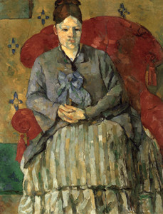 Madame Cézanne nella poltrona rossa, 1877, Olio su tela; cm 72,5 x 56, Boston (Massachusetts), Museum of Fine Arts. Hortense Fiquet, compagna di Cézanne dal 1869 e sua moglie dal 1886, è la modella preferita del pittore: con pazienza e docilità ha posato per i ventiquattro dipinti che oggi di lei si conoscono. La relazione fra Hortense e Cézanne rimane segreta fino al 1878 poiché il pittore non ha il coraggio di affrontare il giudizio paterno dal quale dipende profondamente. Per questa ragione è spesso costretto a chiedere aiuto finanziario a Zola, in quanto l'assegno mensile del vecchio Cézanne non è sufficiente alle necessità della famiglia. Tuttavia, quando Louis-Auguste, molti anni dopo, verrà a conoscenza della situazione del figlio e dell'esistenza di un nipote di sei anni, dopo qualche renitenza si dimostrerà accondiscendente e aumenterà l'importo della sovvenzione all'artista. |