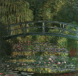 Stagno delle ninfee, armonia in verde, 1899, Olio su tela; cm 89 x 93, Parigi, Musée d'Orsay. Nel giardino di Giverny c'è un «minuscolo stagno dalle acque sempre limpide». Monet lo circonda di splendidi alberi e ne cosparge la superficie di esotiche ninfee gialle, bianche, rosa e violette. «Sopra quest'acqua fiorita, un leggero ponte di legno, sul genere dei ponti giapponesi, e nell'acqua, tra i fiori, tutto il cielo che filtra, tutta l'aria che gioca attraverso gli alberi, tutto il movimento del vento, tutte le sfumature delle ore, tutta la gracile immagine della natura circostante». |